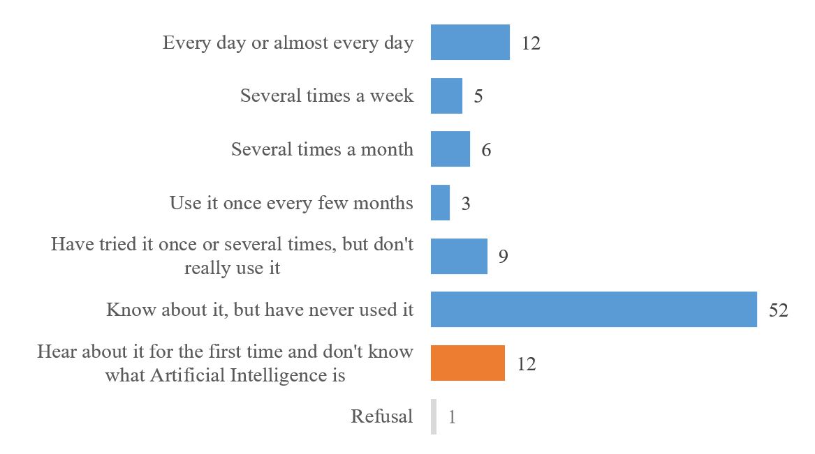 Another 9% of respondents tried using AI, but did not implement it in their daily lives. Only 26% of respondents have experience in practical use of AI, of which: