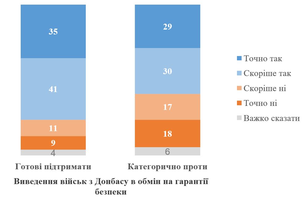 Отже, можна отримати позитивний результат референдуму з «правильно» сформульованим запитанням. Тобто ми бачимо, що більшість українців відкидають виведення військ з Донбасу в обмін на гарантії безпеки (тим більше коли гарантії від США не виглядає переконливо). Але якщо ці всі моменти «не згадуються» чи «запаковуються» у гарні слова і акценти, це підвищує можливість отримати схвалення на всенародному волевиявленні. Зрозуміло, що під час підготовчої кампанії та інформування багато чого буде прояснено для громадян, але в нинішній ситуації є високі ризики маніпуляцій з референдумом. Це має враховуватися і владою України, і українською громадськістю, і Західними партнерами України.