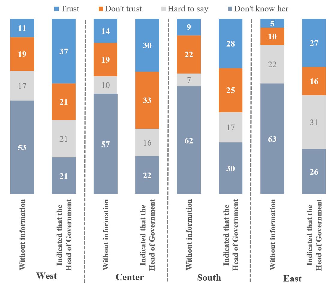 [1] The composition of the macroregions is as follows: Western macroregion - Volyn, Rivne, Lviv, Ivano-Frankivsk, Ternopil, Zakarpattia, Khmelnytskyi, Chernivtsi oblasts; Central macroregion - Vinnytsia, Zhytomyr, Sumy, Chernihiv, Poltava, Kirovohrad, Cherkasy, Kyiv oblasts, Kyiv city, Southern macroregion - Dnipropetrovsk, Zaporizhzhia, Mykolaiv, Kherson, Odesa oblasts, Eastern macroregion - Donetsk, Luhansk and Kharkiv oblasts. [2] Level of trust in individual Ukrainian politicians // https://www.kiis.com.ua/?lang=ukr&cat=reports&id=1531&page=1