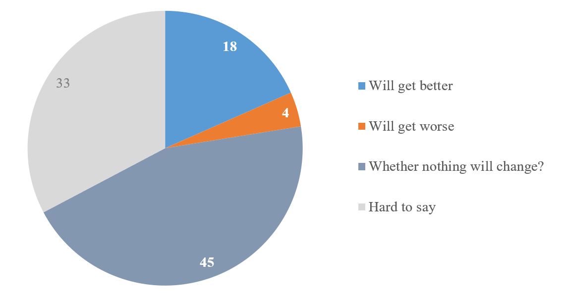About half of respondents (45%) believe that the Government's activities will not change after the appointment of Yu. Svyrydenko as Prime Minister. Another 33% could not formulate their expectations. Thus, the absolute majority of Ukrainians (78%) currently have neither positive nor negative expectations from the Government of Yu. Svyrydenko. At the same time, have positive expectations and believe that the Government's activities will improve – 18%. Have negative expectations and believe that the Government's activities will worsen – 4%