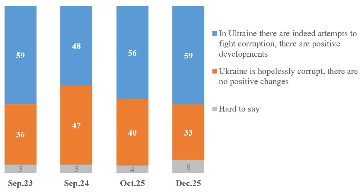 The majority of Ukrainians – 59% (in September – 56%) – continue to believe that there are indeed attempts to fight corruption in Ukraine and that there are positive developments. At the same time, hold the opinion that Ukraine is hopelessly corrupt – 33% (in September it was 40%).
