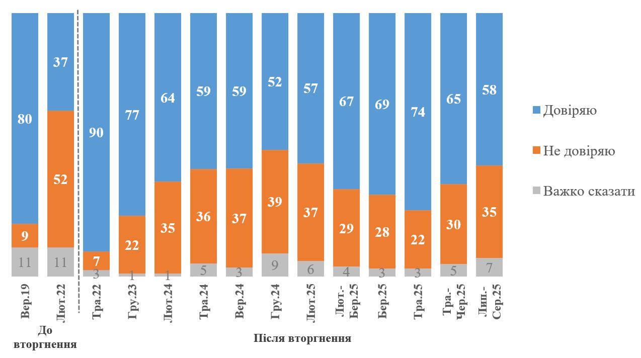 Упродовж 23 липня-4 серпня 2025 року Київський міжнародний інститут соціології (КМІС) провів власне всеукраїнське опитування громадської думки «Омнібус», до якого за власною ініціативою додав запитання про довіру Президенту В. Зеленському. Методом телефонних інтерв’ю (computer-assistedtelephoneinterviews, CATI) на основі випадкової вибірки мобільних телефонних номерів (з випадковою генерацією телефонних номерів та подальшим статистичним зважуванням) у всіх регіонах України (підконтрольна Уряду України територія) було опитано 1022 респондентів. Опитування проводилося з дорослими (у віці 18 років і старше) громадянами України, які на момент опитування проживали на території України, яка контролювалася Урядом України. До вибірки не включалися жителі територій, які тимчасово не контролюються владою України (водночас частина респондентів – це ВПО, які переїхали з окупованих територій), а також опитування не проводилося з громадянами, які виїхали за кордон після 24 лютого 2022 року. Формально за звичайних обставин статистична похибка такої вибірки (з імовірністю 0,95 і з врахуванням дизайн-ефекту 1,3) не перевищувала 4,1% для показників, близьких до 50%, 3,5% для показників, близьких до 25%, 2,5% - для показників, близьких до 10%, 1,8% - для показників, близьких до 5%. За умов війни крім зазначеної формальної похибки додається певне систематичне відхилення. Фактори, що можуть впливати на якість результатів в умовах «воєнного часу», наводилися раніше КМІС. Загалом, ми вважаємо, що отримані результати все одно зберігають високу репрезентативність та дозволяють досить надійно аналізувати суспільні настрої населення