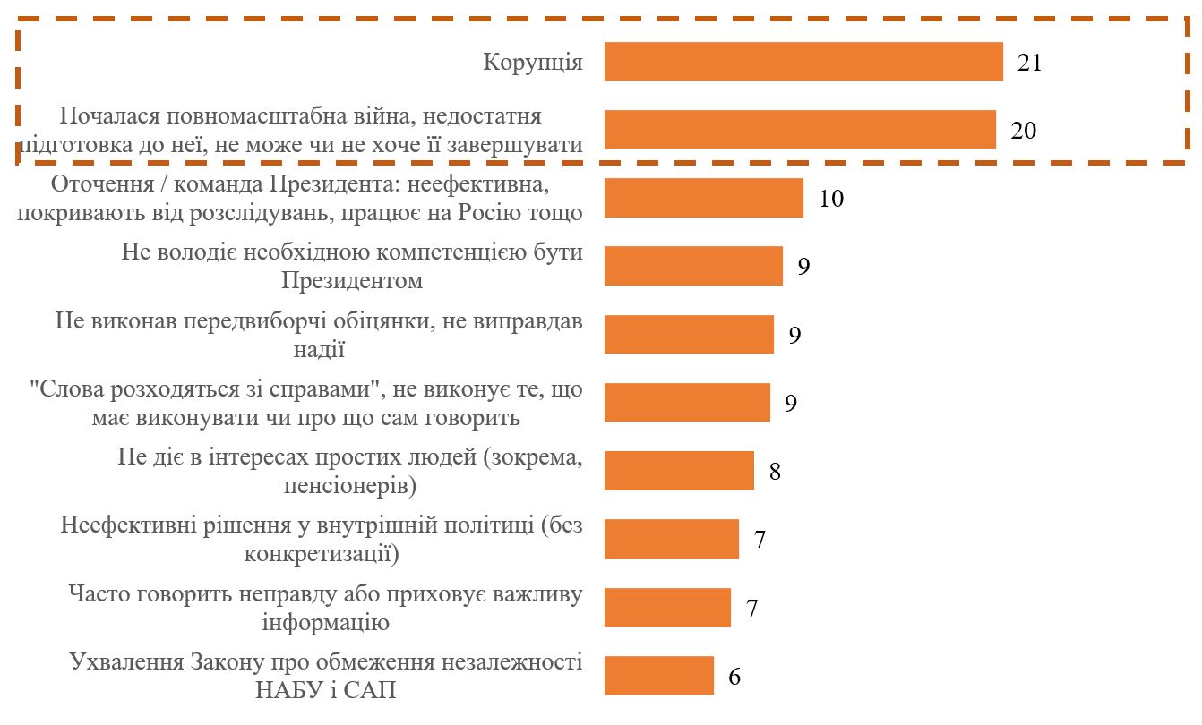 Респондентам, які відповіли, що не довіряють Президенту, ми ставили додаткове запитання у відкритій формі (тобто без наперед сформульованих варіантів відповідей), чому саме вони йому не довіряють. На графіку 4 наведені топ-відповіді респондентів (повний перелік відповідей – у Додатку). Респонденти називали різні причини, чому вони не довіряють, і немає однієї-єдиної причини, про яку сказали би більшість. Водночас відносно найчастіше респонденти висловлювали незадоволення корупцією (переважно у формі корупції в країні / у владі і лише в одиничних випадках звинувачували в корумпованості безпосереднього самого Президента) і війною. Окремо зазначимо, що 6% таких респондентів прямо зазначили, що вони були незадоволені голосуванням 22 липня 2025 року і через це не довіряють Президенту.