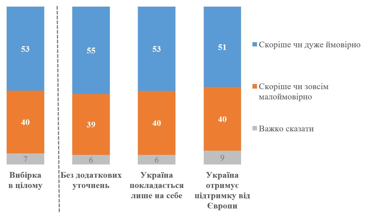 Як можна бачити, загалом 53% вважають скоріше чи дуже ймовірним, що через 10 років Україна буде процвітаючою країною-членом ЄС. Вважають це скоріше чи зовсім малоймовірним – 40%. Водночас, як виявилося, додаткова інформація про необхідність покладання на власні сили чи про стабільну підтримку від Європи практично не вплинула на оцінку ймовірності квітучого майбутнього через 10 років. Незалежно від умов-сценарію половина (51-55%) вважають імовірним успішне майбутнє, а 39-49%, навпаки, мають песимістичні очікування. Можливо, серед українців уже є доволі кристалізоване уявлення про роль і потенціал Європи як надійного союзника, тому додаткова інформація, яку ми зачитували, уже не мала вплив на оцінку ймовірності респондентом.