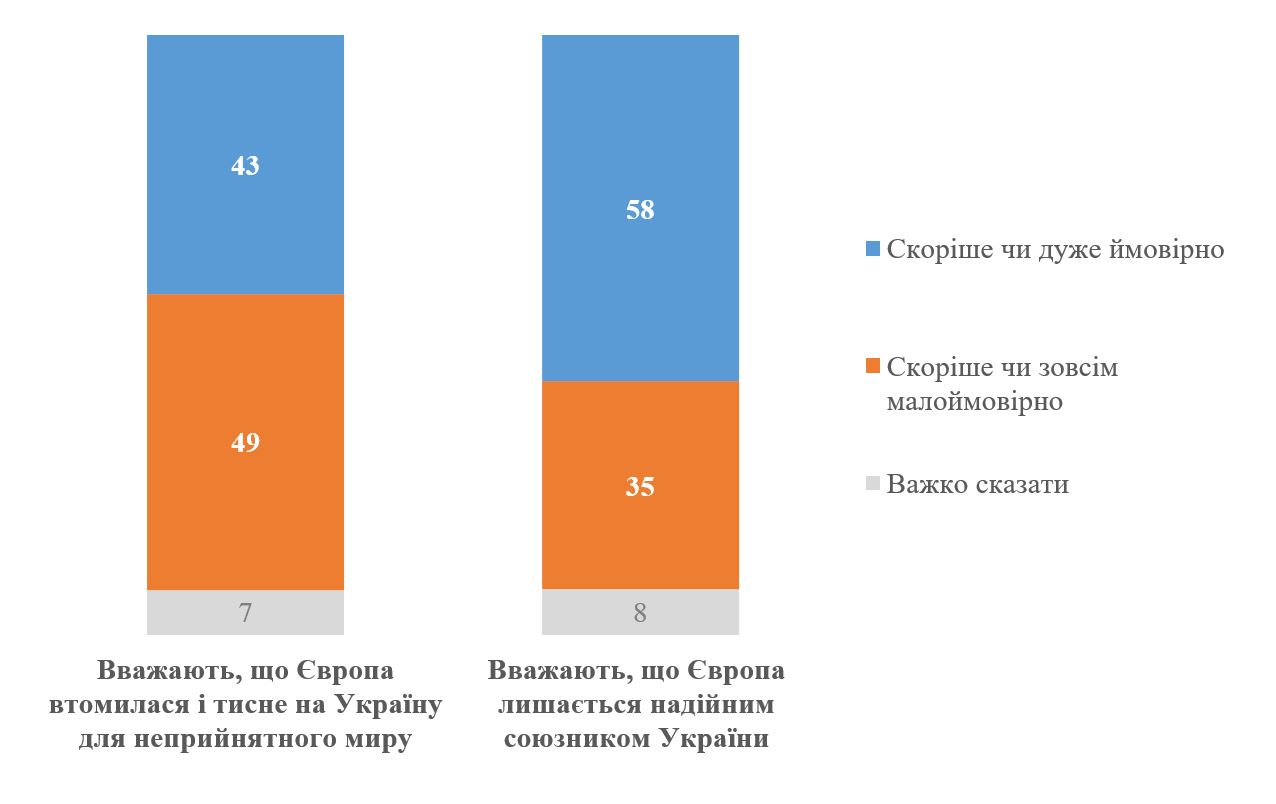 У цьому ж опитуванні ми ставили запитання, як українці сприймають політику Європи щодо України. Так, 63% продовжують вважати Європу надійним союзником, а 27%, навпаки, вважають, що Європа втомилася і тисне для неприйнятного миру[4]. На графіку нижче наведені дані, як ці сегменти населення України оцінюють імовірність бути процвітаючою країною через 10 років. Так, серед українців, які досі відчувають надійну підтримку Європи, рівень оптимізму вищий – серед них 58% вважають, що Україна буде через 10 років процвітаючою країною, не вважають так – 35%. Серед же тих, хто розчарований підтримкою Європи, лише 43% є оптимістами проти 49%, які песимістично оцінюють майбутнє країни.