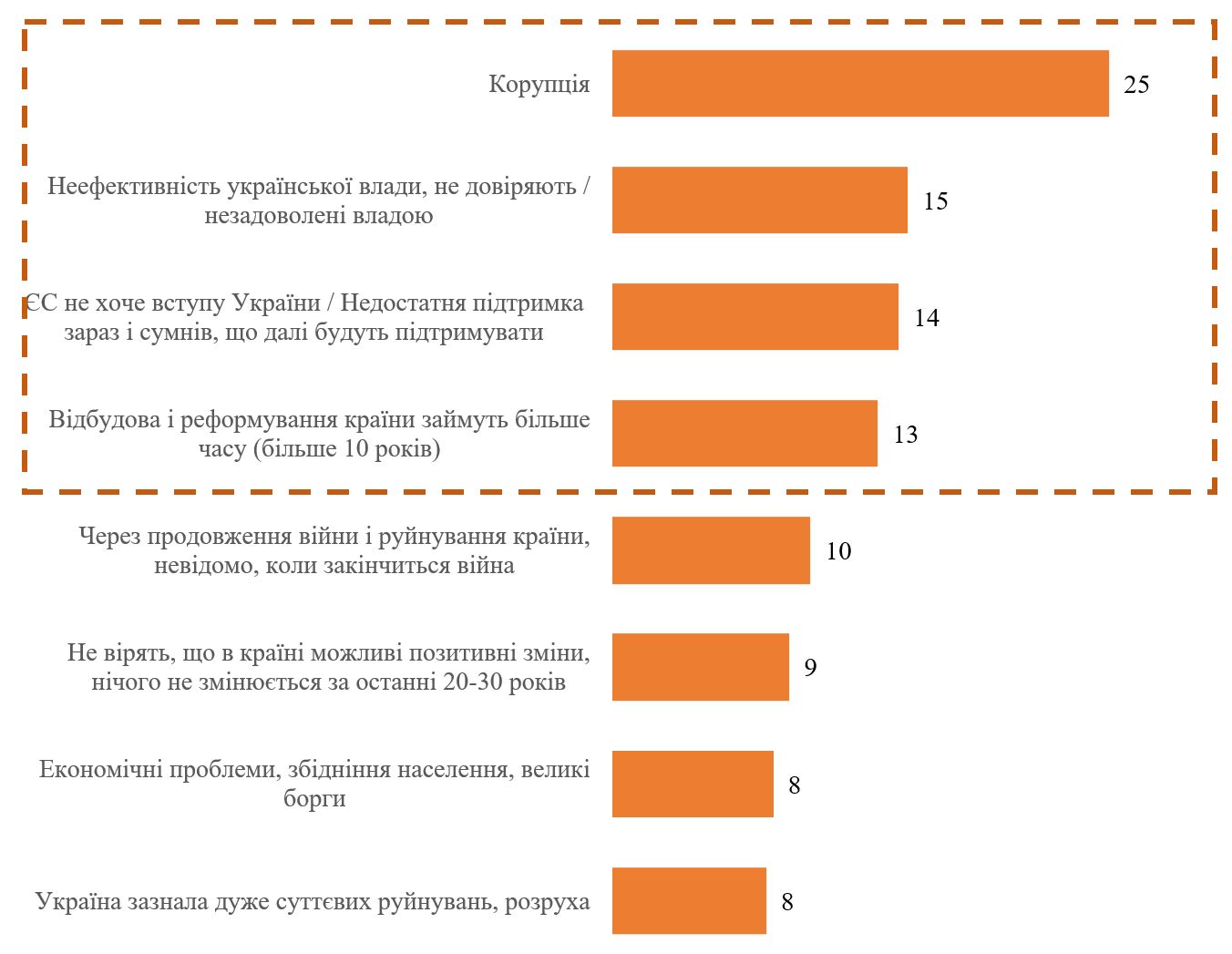 Також респондентам, які вважають малоймовірним або сумніваються в щасливому майбутньому через 10 років, ставилося додаткове запитання у відкритій формі – чому саме вони так вважають. Нижче на графіку наведені основні відповіді (а в Додатку можна знайти повний перелік відповідей). Так, найчастіше респонденти пояснювали це поширеністю корупції в Україні, неефективністю / незадоволеністю українською владою, небажанням самого ЄС приймати Україну, тим, що відбудова займе більше 10 років і взагалі значними руйнуваннями країни через війну.