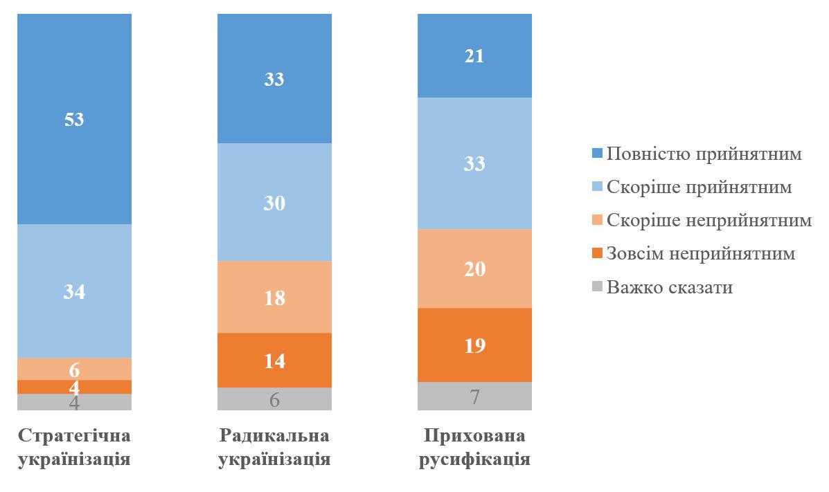 Отже, ми зачитували респондентам три умовні варіанти мовної політики. У кожному варіанті були чотири пункти (див. нижче деталізацію) і всі вони зачитувалися (водночас ми не зачитували респондентам дослідницьку назву, тобто не говорили, що запитуємо їх про, наприклад, «приховану русифікацію»). Респонденту зачитувався лише один (випадково відібраний) варіант і ми запитували, наскільки такий варіант є прийнятним. Хоча ці варіанти є спрощеними, але при цьому вони дають розуміння можливих напрямків мовної політики. Нижче наведена деталізація для кожного варіанту.