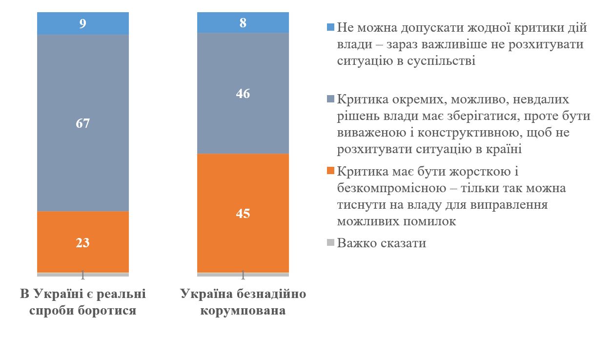 На графіку нижче наведені дані, як ставляться до критики влади ті, хто оптимістично / песимістично сприймає боротьбу з корупцією в Україні. Серед тих, хто вважає Україну безнадійно корумпованою, більше тих, хто наполягає на безкомпромісній критиці, але навіть серед них таких лише близько половини (45%). Водночас 54% тих, хто вважає Україну безнадійно корумпованою, виступають за конструктивну критику або проти критики взагалі.