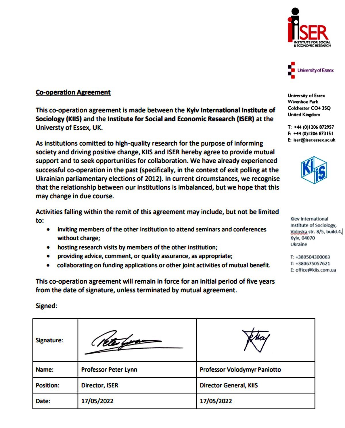 Цю угоду про співпрацю укладено між Київським міжнародним інститутом соціології (КМІС) та Інститутом соціально-економічних досліджень (ISER) Університету Ессекса, Великобританія. Як інституції, які займаються високоякісними дослідженнями з метою інформування суспільства та стимулювання позитивних змін, КМІС та ISER погоджуються надавати взаємну підтримку та шукати можливості для співпраці. Ми вже мали досвід успішної співпраці в минулому (зокрема, у контексті екзит-полу на виборах до Верховної Ради України 2012 року). У нинішніх обставинах ми визнаємо, що відносини між нашими установами незбалансовані, але ми сподіваємося, що це може змінитися з часом. Діяльність, що входить до сфери дії цієї угоди, може включати, але не обмежуватися:
