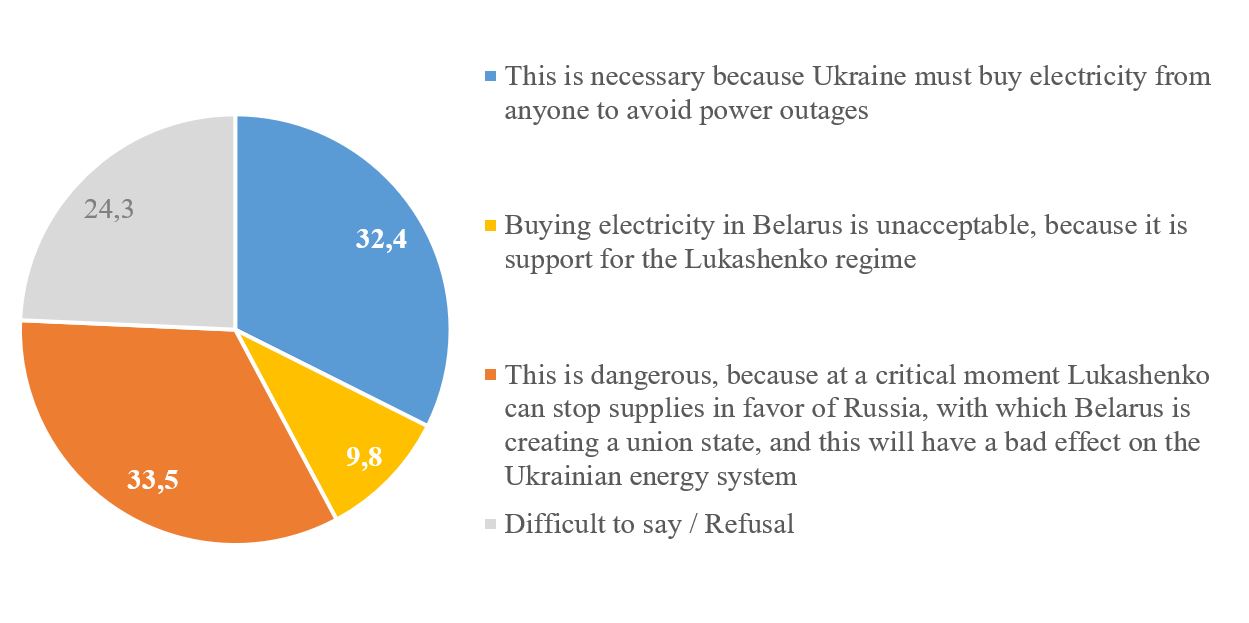 Respondents' opinions on the purchase of electricity in Belarus were divided. On the one hand, 32.4% of respondents believe that this is necessary to avoid outages. On the other hand, 33.5% consider it dangerous, as Belarus and Russia will be a common Union State, and another 9.8% consider it unacceptable given that it is support for the O. Lukashenko regime. At the same time, a quarter of respondents (24.3%) could not decide their opinion.