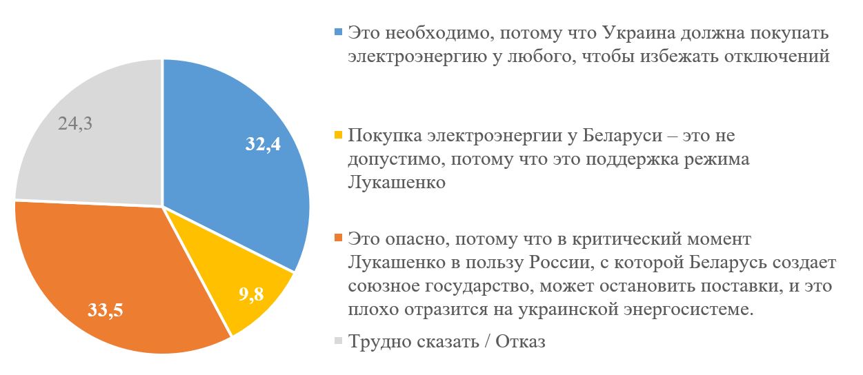 Мнения респондентов по поводу покупки электроэнергии у Беларуси разделились. С одной стороны, 32,4% респондентов считают, что это необходимо во избежание отключений. С другой стороны, 33,5% считают это опасным, поскольку Беларусь и Россия будут общим Союзным государством, а еще 9,8% считают это недопустимым ввиду того, что это поддержка режима А. Лукашенко. При этом четверть респондентов (24,3%) не смогли определиться со своим мнением.