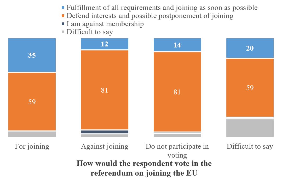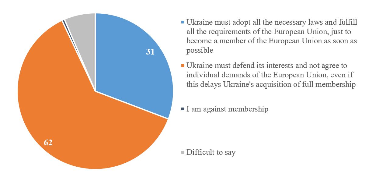 Although there is a consensus in Ukrainian society about joining the EU (81% support joining the EU), at the same time, 62% of respondents generally hold the opinion that Ukraine should defend its interests and not agree to certain demands, even if it delays the acquisition full membership. At the same time, 31% of respondents believe that Ukraine should approve all necessary laws and fulfill all EU requirements in order to become a member of the organization as soon as possible.