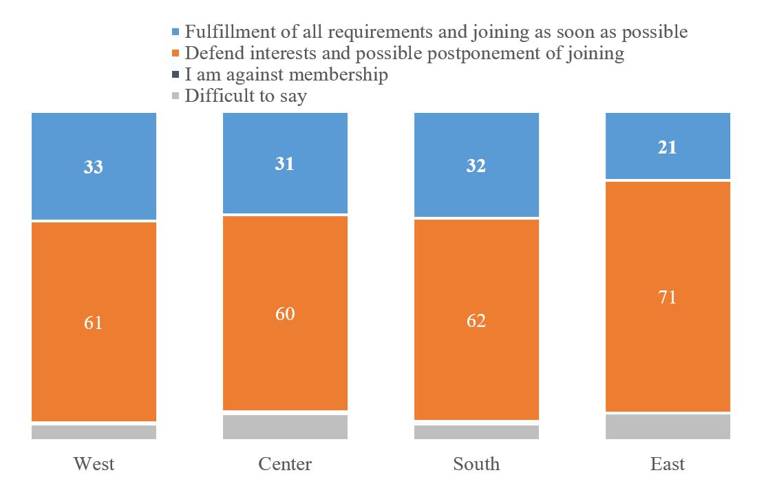 On graph 2, the data are shown in regional dimension[1]. As we showed earlier, there is consensus and support for European integration among the regions. We also see that the majority of residents in all regions would rather choose the option to defend their interests and not agree to certain demands, even if this would delay joining the EU.