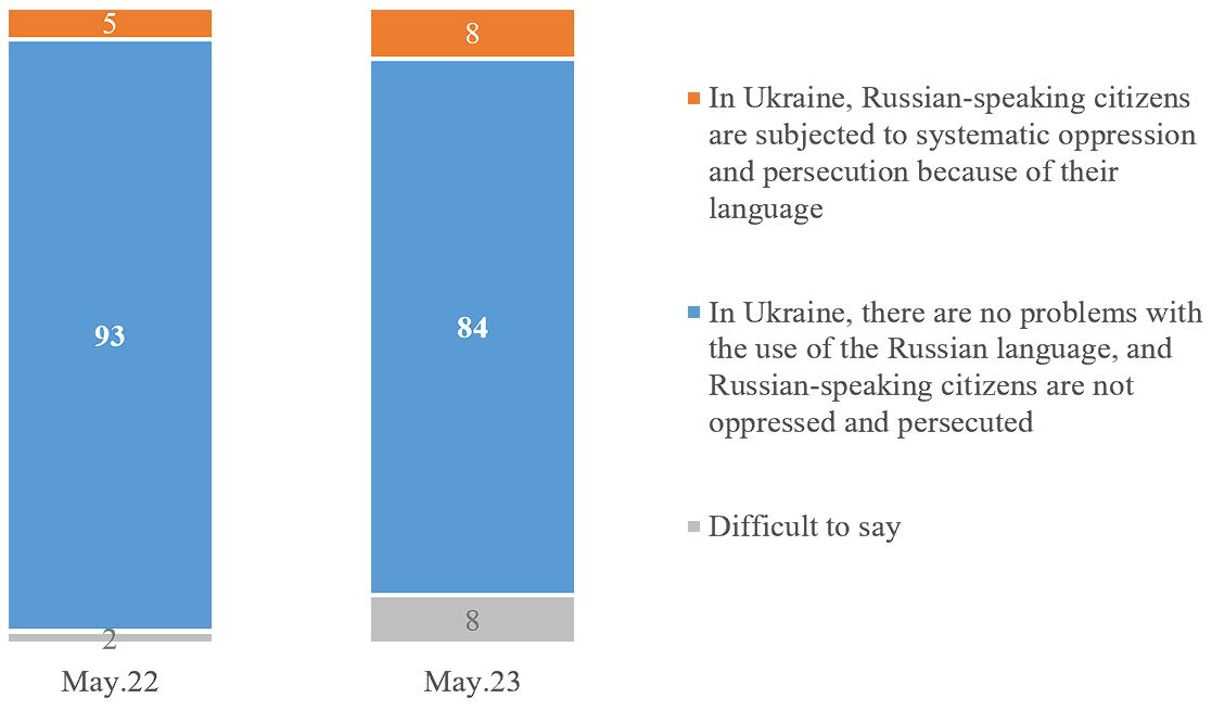 "Systematic oppression and persecution of Russian-speaking citizens" is an obvious lie for ordinary Ukrainians, because it contradicts their everyday experience of the peaceful coexistence of different languages in Ukraine (with a respectful attitude towards the Ukrainian language as a symbol of Ukrainian statehood). There were not and are not objective serious language problems in Ukraine, and "oppression and persecution" is the product of Russian propagandists with the aim of splitting Ukrainian society (although we also see some Ukrainian subjects who continue to speculate on this issue). Currently, the absolute majority of Ukrainians, regardless of their region of origin, language of communication, or nationality, believe that there are no problems with using the Russian language. At the same time, there is a noticeable trend that now, after all, there are slightly fewer people who are sure of this. However, such a decrease is quite expected, since since May 2022 the language issue has become the subject of discussions (although in many cases it is more correct to speak not about reasoned discussions, but about speculations on human emotions, where "exaggeration of measure" often took place). The revitalization of discussions about the use of the "language of the aggressor" is caused precisely by Russia's aggression, which does not protect, but contributes to the deterioration of the attitude towards the Russian language. In addition, by February 2022, among the Russian-speaking population, support for pro-Russian parties was higher and support for European integration was lower. Now this difference has radically decreased and is becoming more and more insignificant. But a certain part of the population has not yet realized this and has a negative attitude towards Russian speakers (according to our research in February 2023, 7% of the population would not want Russian-speaking citizens to live in Ukraine). We should also note that discussions in social networks are always more radical and create the impression of significant problems, when there are no such problems among the population as a whole. The process of developing a consensus view on language policy is still ongoing and a certain variability of views may persist. However, in any case, we see clear contours of consensus, where one of the basic elements is the understanding that Russian-speaking citizens are not a backward category of citizens and this category definitely does not need the protection of an aggressive Russia.