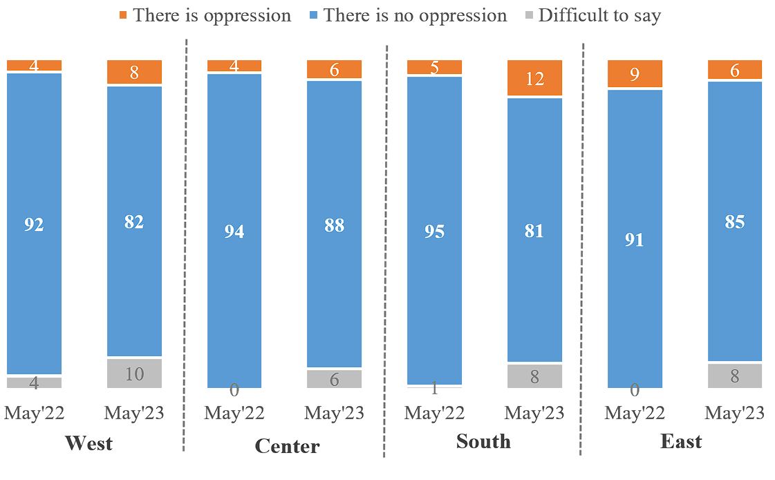 In the graph below, the data is shown in a regional dimension with a comparison with May 2022. In all regions of Ukraine, the absolute majority of the population, as in 2022, believes that there is no oppression and persecution of the Russian-speaking population. In particular, among the residents of the East[1], 85% think so, and among the residents of the South - 81%.