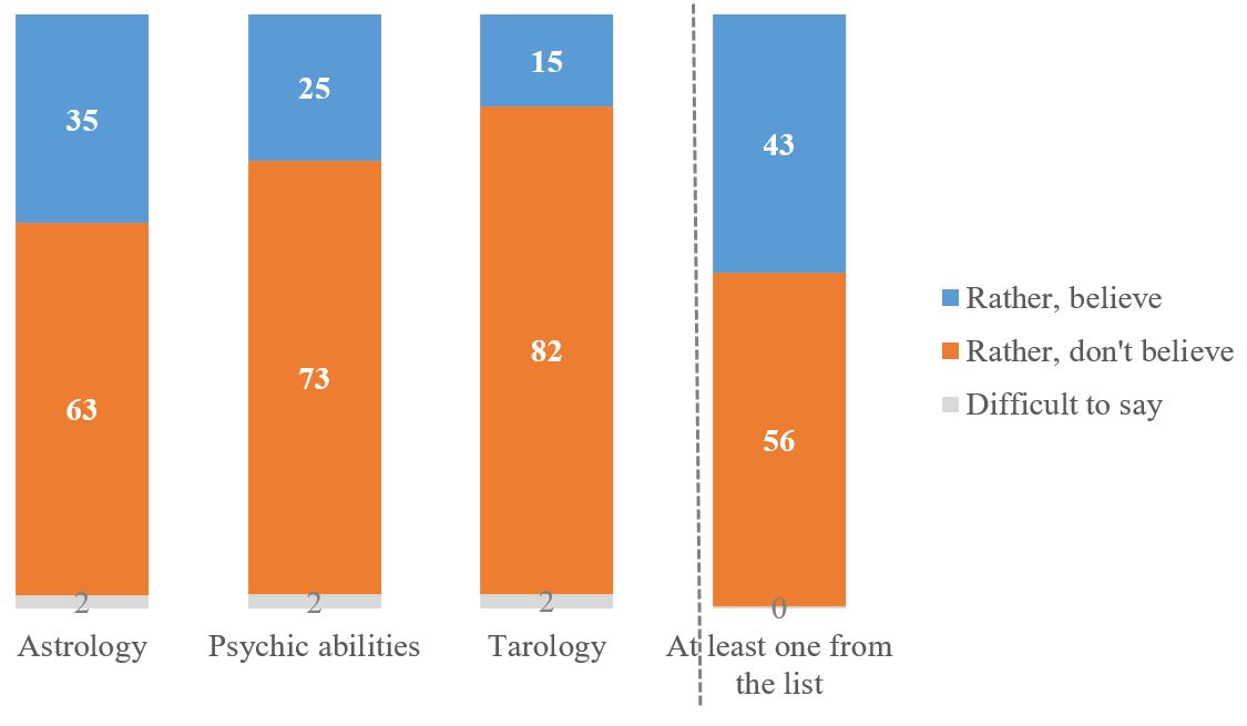 It should be taken into account that the content of the questions may influence the sincerity of the answers. On the one hand, some respondents could give joking answers that they supposedly believe, although in fact it is not so. We polled the interviewers conducting the interviews as to whether they thought the respondents were being serious in answering the questions, and almost all of the interviewers were fairly confident that the answers sounded serious (although, of course, this does not guarantee that the respondents really seriously answered). On the other hand, some respondents, on the contrary, may believe, but did not want to voice it publicly to the interviewer. Currently, we have no way to assess the impact of the sincerity of the answers to this particular question, but the experience of conducting surveys allows us to place confidence in the general trends obtained. So, 35% of Ukrainians believe in astrology, 25% in psychic abilities, 15% in tarology. 43% of Ukrainians believe in at least one of this list.