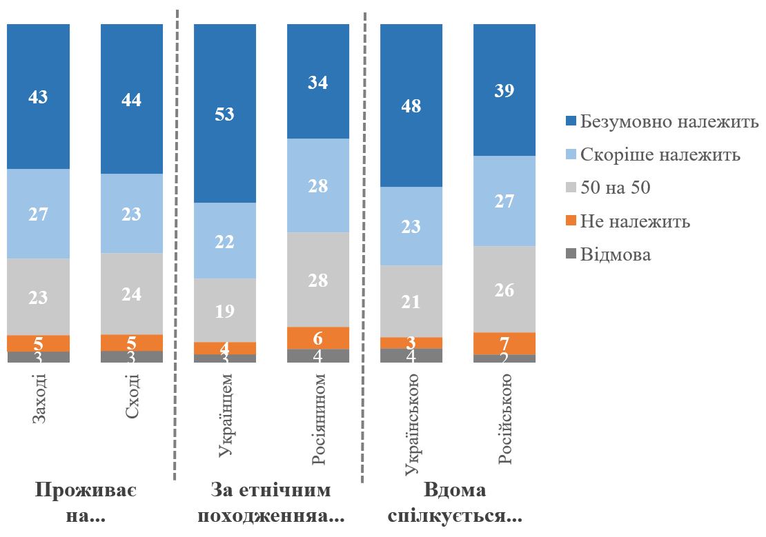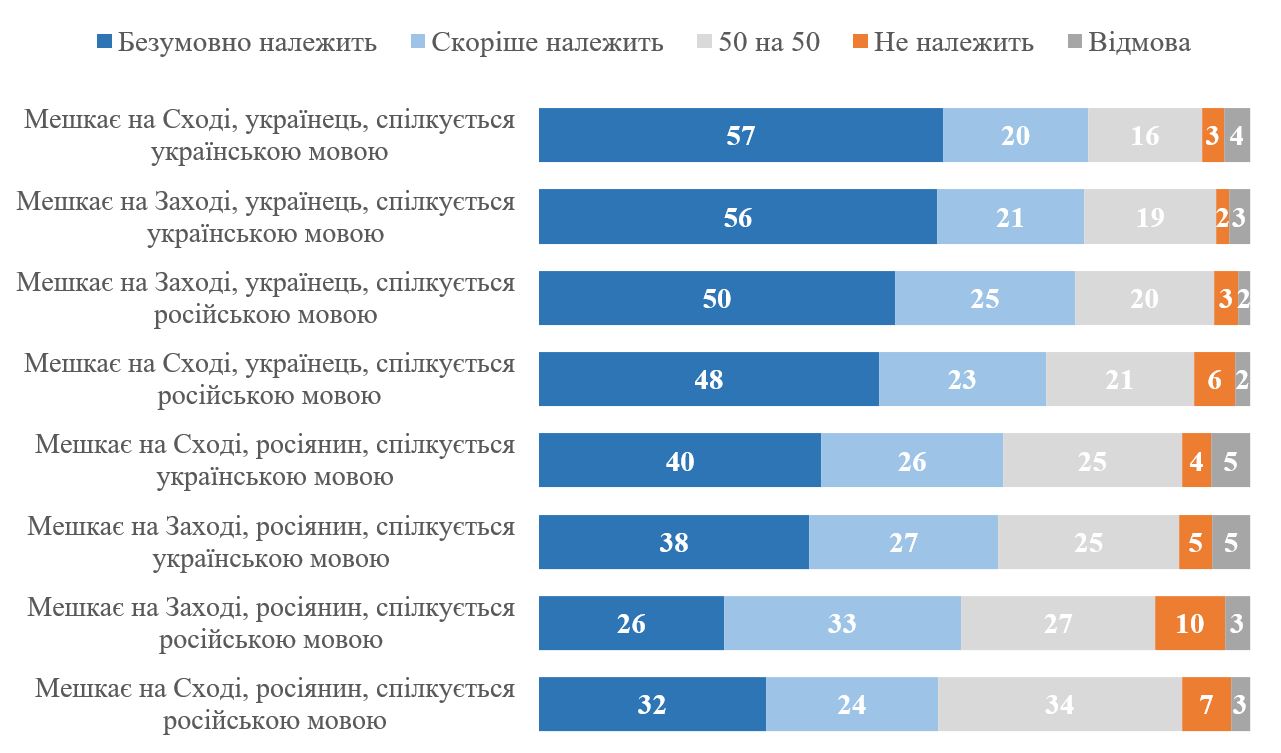 Так, відносно найгірша ситуація з російськомовними росіянами на Заході і Сході. Їх, відповідно, 59% і 56% загалом зараховують до української нації (і з них, відповідно, 26% і 32% безумовно вважають такими). Відносно найкраща ситуація – з українськомовними українцями на Заході і Сході. Так, 77% (незалежно від регіону) загалом зараховують до української нації, а безумовно зараховують – відповідно, 57% і 56%. Таким чином, ми інтерпретуємо результати як те, що незалежно від регіону, етнічного походження і мови респонденти відкриті до включення людини до української нації, якщо вона любить Україну і засуджує російську агресію. Водночас від окремих категорій (у першу чергу – етнічні росіяни, у меншій мірі – російськомовні) очікується дещо більше «зусиль», щоб довести, що вони дійсно є частиною української нації. Або інший варіант трактування – наявність певних характеристики (українське етнічне походження, українська мова) підвищує ймовірність, що людину «за замовчуванням» будуть вважати належною до української нації.