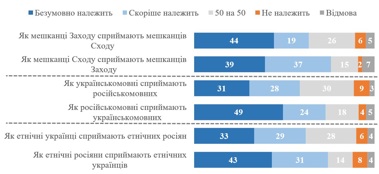 І насамкінець ми хотіли би розглянути, наскільки ми маємо симетричне чи ні сприйняття мешканцями Заходу мешканців Сходу (і навпаки), а також, яким є ставлення українськомовних українців до російськомовних українців (і навпаки). Отже, на графіку нижче наведені результати. Насамперед потрібно підкреслити, що фактично має місце «взаємне визнання»: більшість мешканців Заходу вважають мешканців Сходу (які люблять Україну і засуджують Росію) частиною української нації і серед мешканців Сходу більшість вважають те саме щодо мешканців Заходу. Серед українськомовних українців більшість вважають російськомовних українців частиною української нації, і навпаки. Проте все-таки є важливі відмінності у сприйнятті, особливо це стосується мови спілкування і етнічного походження. Так, серед російськомовних українців 73% загалом і з них 49% безумовно зараховують українськомовних українців до української нації. Серед же українськомовних українців аналогічні показники для російськомовних українців – відповідно, 59% і 30%. Різниця переважно за рахунок тих, хто відповів «50 на 50» (так, серед українськомовних українців лише 9% вважають, що російськомовні українці не є частиною української нації). Подібна тенденція простежується і у випадку етнічної належності (етнічні українці більш обережні у зарахуванні етнічних росіян до української нації, хоча серед них лише 6% виключають етнічних росіян з української нації).
