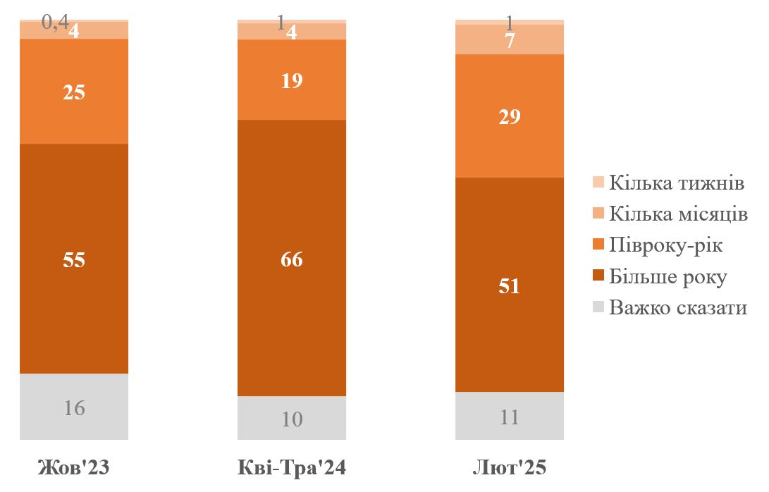 Також респондентам ставилося запитання, скільки, на їх думку, буде тривати ще війна. Порівняно з травнем 2024 року з 66% до 51% стало менше тих, хто вважає, що війна триватиме більше року. Водночас з 24% до 38% стало більше тих, хто вважає, що війна триватиме до 1 року (переважно відповіді були про пів року-рік).