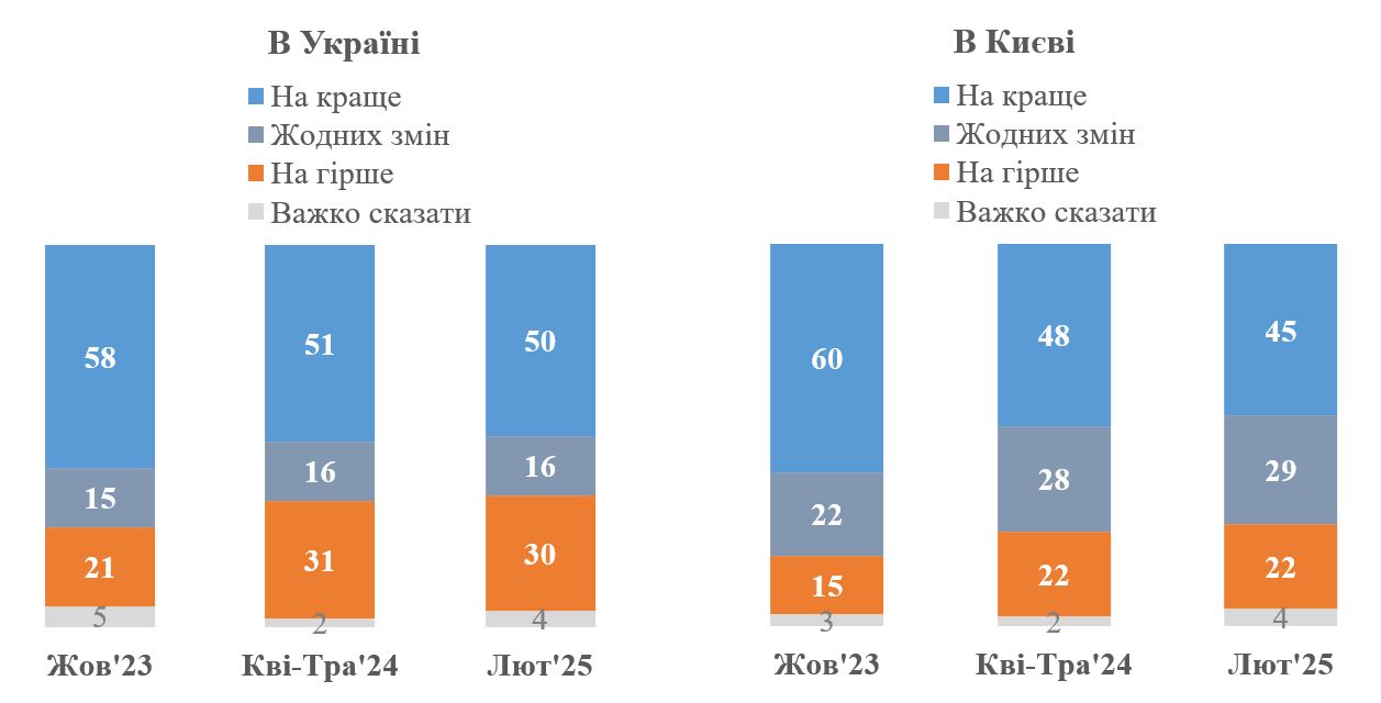 У випадку очікувань щодо змін у найближчі 12 місяців в Україні та Києві погляди киян майже не змінилися порівняно з травнем 2024 року. Так, щодо змін в Україні 50% очікують на зміни на краще, 30% – зміни на гірше, а ще 16% – що жодних змін не буде (у травні 2024 року показники були, відповідно, 51%, 31% і 16%). Щодо змін у Києві, то 45% очікують на зміни на краще, 22% – зміни на гірше, 29% – що жодних змін не буде (у травні 2024 року показники були, відповідно, 48%, 28% і 22%).