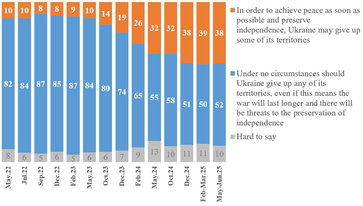 We specially emphasize that the first statement does not specify which territories may be the subject of concessions, and also what “territorial concessions” are in question. Another factor is that our formulation provides a more socially acceptable form of accepting losses, since in exchange “the war ends” and “Ukraine retains its independence”. Our experiment in February 2025 showed that Ukrainians strongly react to “preserving sovereignty” and consider it one of the fundamental points for any peace deal. In particular, some respondents could, for example, understand “preserving independence” as receiving security guarantees. That is, their interpretation may be broader than the question directly implies. It is especially important to emphasize that there are several interpretations of “territorial concessions”, so this time, in addition to the original monitoring question, we formulated three alternative formulations, where we more clearly specified what we mean by “territorial concessions”. The respondent was asked a randomly selected 1 of 4 questions. This issue will be considered in more detail in the next paragraph (before graph 2), and first we propose to consider what changed the answers of Ukrainians to our typical monitoring question (where we do not specify the definition of “territorial concessions”). Особливо важливо підкреслити, що є декілька інтерпретацій «територіальних поступок», тому цього разу крім оригінального моніторингового запитання ми сформулювали три альтернативні формулювання, де ми більш чітко конкретизували, що маємо на увазі під «територіальними поступками». Респонденту ставилося випадково обране 1 з 4 запитань. This issue will be discussed in more detail in the next section (before graph 2), but first we propose to consider how Ukrainians’ responses to our typical monitoring question (where we do not specify the definition of “territorial concessions”) have changed. Graph 1 shows the respondents’ answers. Compared to February 2025, the situation has not changed. Thus, 52% of Ukrainians are firmly against any territorial concessions (in February 2025 – 50%). 38% are ready to accept certain territorial losses (in February 2025 – 39%).