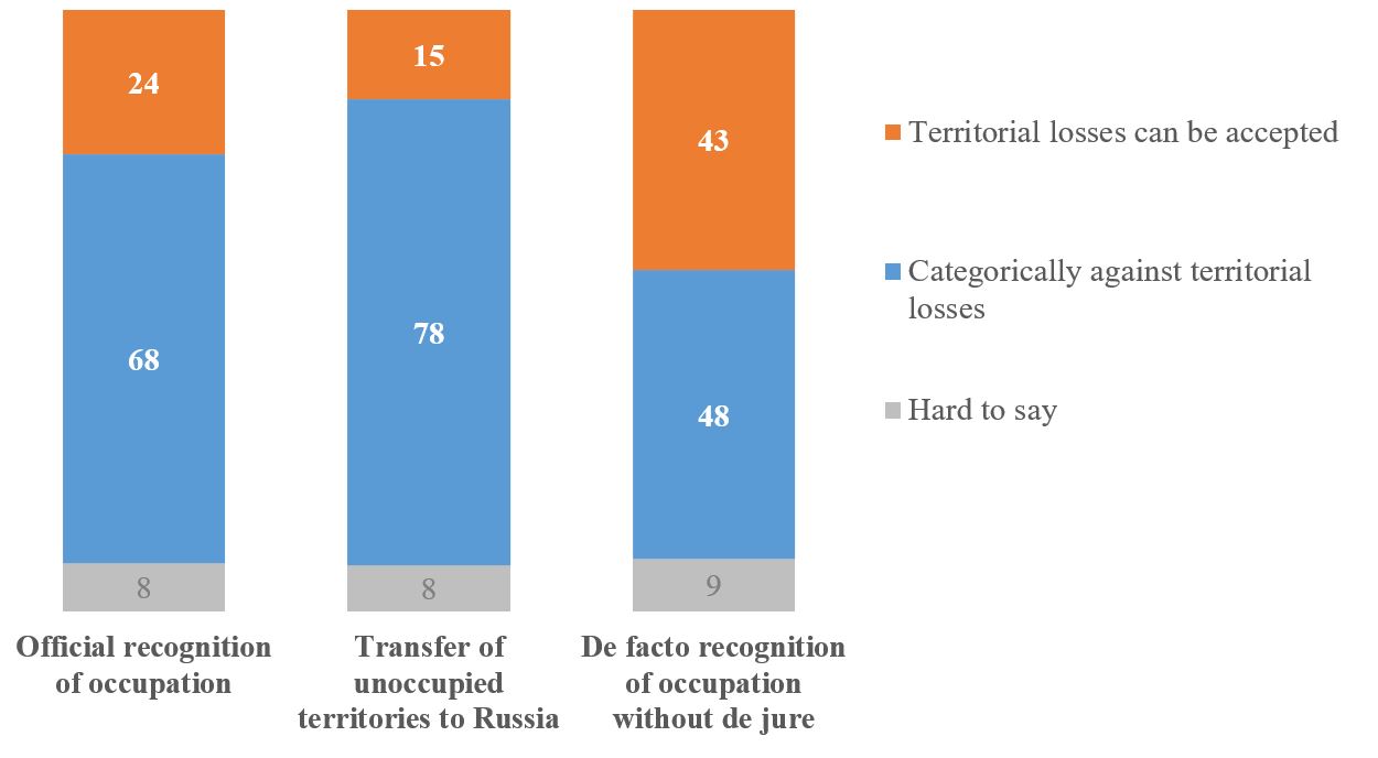 Our survey shows that the issue of territorial losses is extremely sensitive for Ukrainians and, in particular, how exactly “territorial losses” are interpreted plays a significant role. At the same time, this means that (un)readiness for territorial losses can become the subject of manipulation and information campaigns against Ukraine (given that different interpretations of losses have different perceptions by the population). At the same time, based on the survey results, we can say, firstly, that over the past few months, the resilience of Ukrainians has not wavered. We see this from our monitoring question on readiness for territorial concessions, which has not changed (and from another question on readiness to endure war, even more people are now ready to endure as much as necessary). Secondly, Ukrainians have clear “red lines” on territorial issues, such as the official recognition of occupied territories as part of Russia or the transfer of unoccupied territories under Russian control. These demands are unacceptable and will not be approved by the majority of the population. Third, Ukrainians retain a healthy flexibility and are ready to make painful concessions regarding territories, but only in the form of recognition of de facto occupation without legal legalization and only regarding the currently occupied territories. And even in this case, in order to gain approval from the majority of the population, the package must include reliable security guarantees and other important parameters. Thus, Ukrainians want peace, Ukrainians are ready for difficult discussions and compromises, but Ukrainians reject demands for surrender.