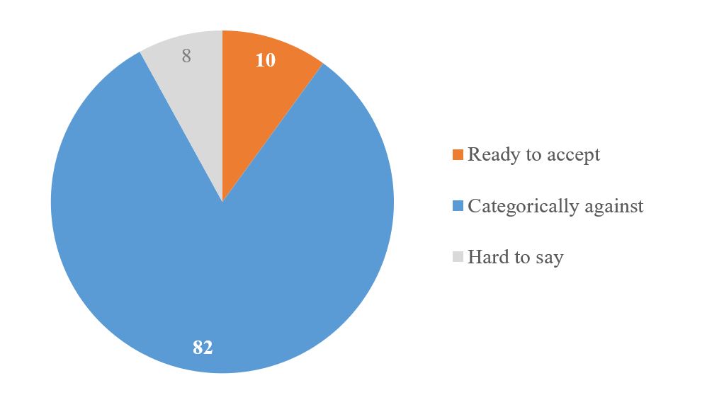 KIIS regularly studies the perception of peace deal packages, because some unpleasant things may be approved by Ukrainians if the package contains other, more important conditions for Ukraine (for example, security guarantees). In this survey, we did not study individual packages, because this was the subject of our other survey in May 2025 and we have already published the results[3]. At the same time, in the current survey, we see that in general 78% of Ukrainians and 76-80% in all regions reject the demand to transfer the unoccupied territories of Zaporizhzhia, Kherson, Donetsk regions under Russian control. However, this demand is one of the core of the Russian Memorandum, handed over to Ukraine on June 2, 2025. Therefore, in the graph below, we remind you how Ukrainians generally relate to the Russian “peace plan”. Thus, 82% categorically reject it and only 10% are ready to accept it. Moreover, we read out only 6 points to the respondents (one of which was the possibility of Ukraine moving towards the EU, which, apparently, was not part of Russia’s proposal in Istanbul), although the real Memorandum includes more points and a greater number of strict demands for Ukraine. That is, if the respondents were familiarized with the full list of points of the Memorandum, most likely, we would have an even higher % of those who are categorically against it.