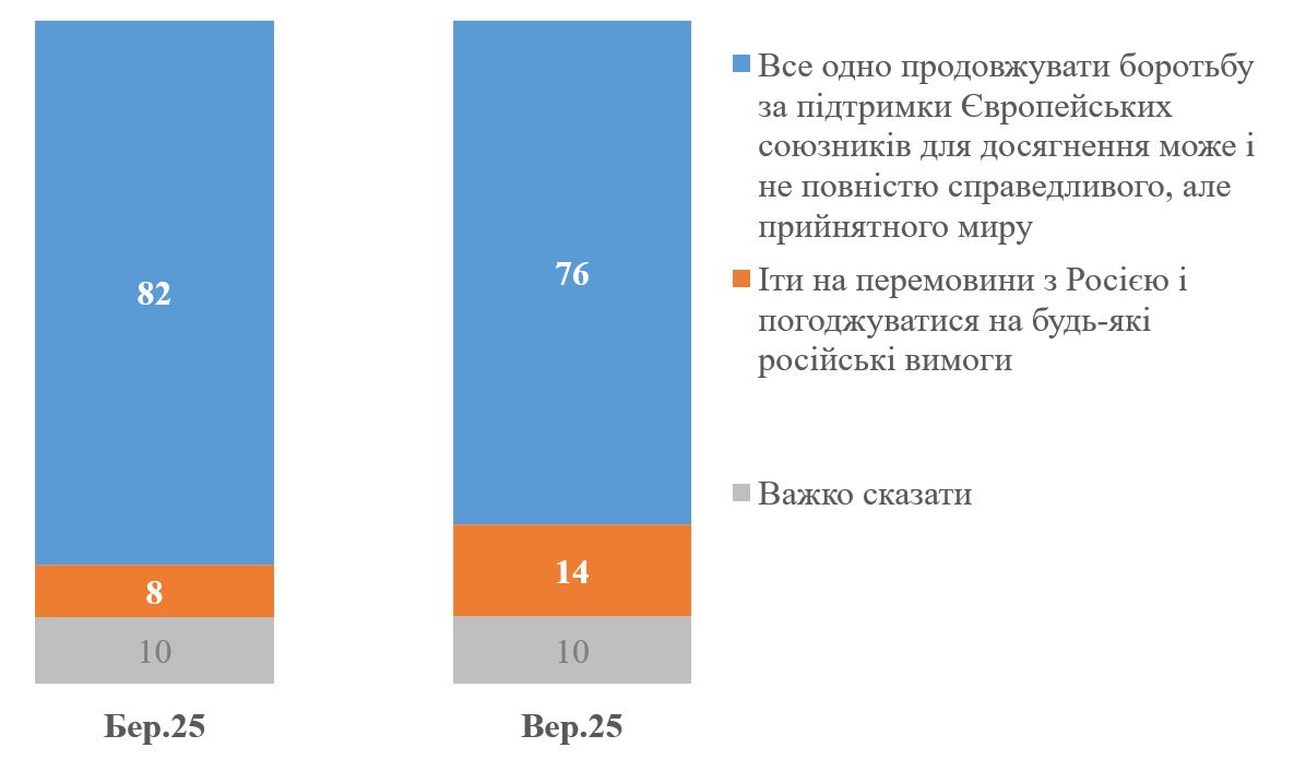 Так, абсолютна більшість українців – 76% – вважають, що навіть без підтримки США Україна має продовжувати боротьбу разом із Європейськими союзниками. Лише 14% вважають, що за таких умов Україна має погоджуватися на будь-які вимоги Росії. Причому з березня 2025 року хоча і стало трохи менше тих, хто налаштований на боротьбу, але в доволі незначній мірі. Тобто думки українців з цього питання майже не змінилися за останні місяці.