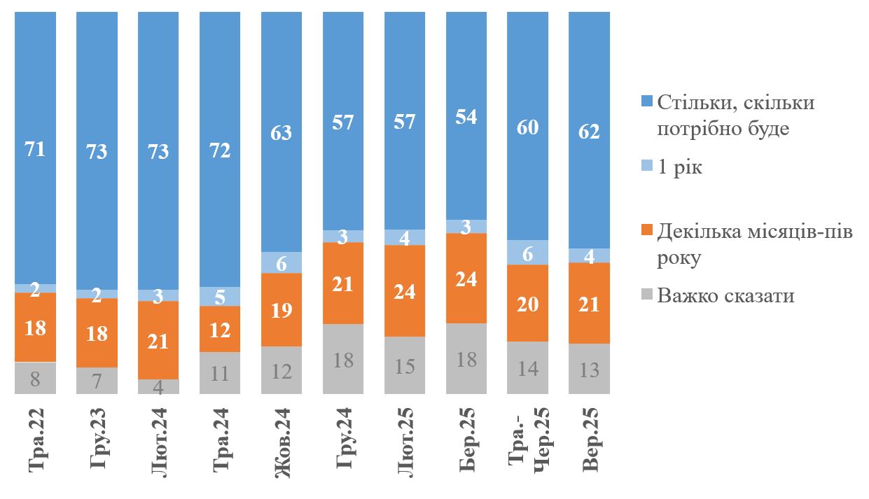 При цьому більшість українців (62%) продовжують відповідати, що вони готові терпіти війну стільки, скільки потрібно (на початку червня 2025 року показники були ідентичні). Ще 4% відповіли, що готові терпіти близько року. Про більш короткий період (пів року чи декілька місяців) говорять 21% респондентів (практично без змін за останні декілька місяців).