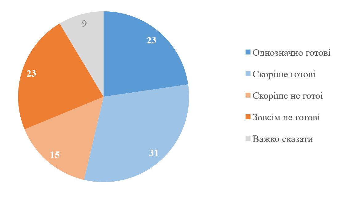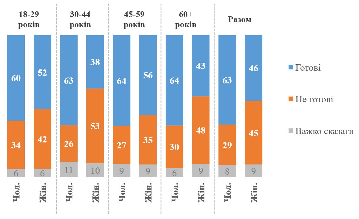 Серед українців (і чоловіків, і жінок у віці 18+ років, які не проходять військову службу) 54% відповідають, що вони скоріше чи однозначно готові у разі потреби приєднатися до Сил оборони і зі зброєю в руках захищати Україну. З них 23% однозначно готові, а ще 31% скоріше готові. Скоріше не готові – 15%, однозначно не готові – 23% (тобто загалом не готові 38%, хоча з них тільки частина категорично відкидає таку готовність). Для порівняння з іншими країнами – за даними Gallup (2023 рік), наприклад, у Польщі готові воювати за свою країну 45%, у США – 41%, у Німеччині – 23%, Великій Британії – 33%, у загалом країнах ЄС – 32% (хоча не всі країни були опитані) (на той же період в Україні за цим формулюванням було 62%)[4]. Водночас треба враховувати, що для українців це питання не є гіпотетичним і абстрактним, а є цілком реальним, тобто від українців можна очікувати більш наближені до реальної поведінки відповіді.
