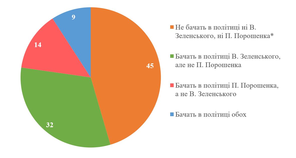 Якщо об’єднати відповіді на два запитання, то загалом 45% респондентів не бачать в політиці після війни ні В. Зеленського, ні П. Порошенка. Ще 46% мають «поляризаційний» підхід, коли бачать у політиці когось одного, але не хотіли би, щоб у політиці лишався другий. Причому більше тих, хто хотів би, щоб лишався В. Зеленський. Так, 32% вважають, що в політиці має залишитися В. Зеленський, але не П. Порошенко. Навпаки хотіли би 14%. І лише 9% відповіли, що хотіли би, щоб в політиці залишилися і В. Зеленський, і П. Порошенко.