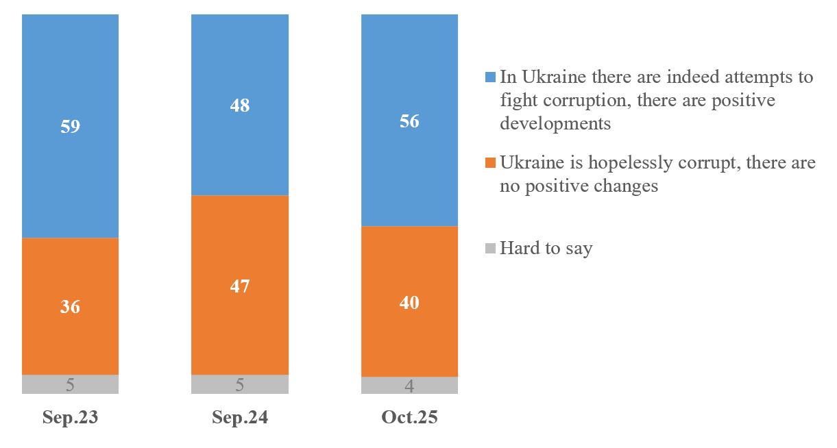 As can be seen in Graph 1 below, between 2023 and 2024, the number of those who were more optimistic about the fight against corruption in Ukraine decreased from 59% to 48% (and the number of those who considered the country hopelessly corrupt increased from 36% to 47%). While in 2023 the majority still believed that there were real attempts to overcome corruption, in 2024 we saw parity in the opinions of optimists and pessimists. Currently, as of early October 2025, 56% of Ukrainians believe that there are real attempts to fight corruption in Ukraine. At the same time, the share of those who consider Ukraine hopelessly corrupt is 40%. That is, between 2024 and 2025, the perception improved, although the indicators remain slightly worse than in 2023.