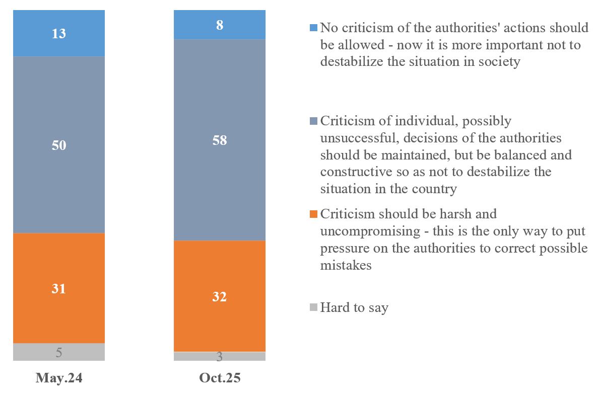 In the case of the question of the appropriateness of criticizing the actions of the authorities, we were interested in whether Ukrainians seek more harsh, uncompromising criticism, or whether they are more inclined to constructive criticism of individual actions of the authorities (or are categorically against any criticism at all). Thus, only 8% of Ukrainians believe that the government should not be criticized at all (and the share of those who think so has decreased from 13% since 2024). In contrast, 90% agree that criticism of the government should be present (an increase from 81% compared to 2024). At the same time, the majority of respondents (58% of these 90%) believe that criticism should be "balanced and constructive so as not to destabilize the situation in the country.". A minority – 32% – insists on harsh and uncompromising criticism. Compared to 2024, the share of those who insist on harsh criticism has not changed, while the share of those who insist on constructive criticism has increased.