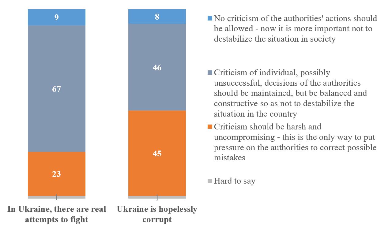 Corruption and the responsibility of the authorities for overcoming it remain a very important and vexing issue for Ukrainian society. There are various opinions on this issue, but we suggest you read Yaroslav Hrytsak's publication "On Corruption, War and History"[3]. So, there is an offer in the publication "... stop talking about Ukraine as a very corrupt country, we should talk about Ukraine as a country that is fighting corruption". As our results show, the narrative of a “hopelessly corrupt Ukraine” is associated with a higher share of those who are ready for any, even the most difficult, conditions to end the war. In our other publication in the near future, we will also show that those who believe in such a narrative are significantly less optimistic about the future of Ukraine. The spearhead of the information war is the enemy's dissemination of ideas about mass evasion of service and total corruption (because this reduces the population's motivation to join the army and reduces support for Ukraine among donor countries). And this adds to the perception of Ukraine as totally corrupt. That is, the spread and entrenchment of such a narrative among the Ukrainian public seriously undermines national security. It is very convenient (and, of course, there are reasons for this) to shift the blame to the authorities and place all responsibility on them: since there are no outstanding successes in the fight against corruption in a short period of time - from the point of view of the average citizen - then the prevalence of such a narrative is exclusively the result of the ineffective actions of the authorities. However, this would be a populist and irresponsible approach, since long-term institution-building and a long-term strategy for reducing corruption are the business of the whole society - from officials in government offices to ordinary citizens. A special responsibility lies with the media community and “profile” public activists, who with their revelations and investigations emotionally stir up the already psychologically tired Ukrainian public. As our results show, the majority of Ukrainians support constructive criticism of the authorities. This is quite compatible with promoting a more optimistic narrative about corruption (“Ukraine is a country that fights corruption”), so for the common good it would be great if the next sensational revelations and investigations followed this approach.