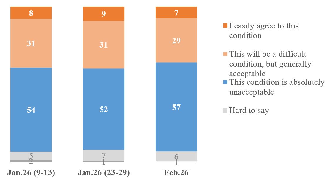 Now I will read a possible condition for achieving peace, and you tell me how acceptable it is to you. Use the scale “I easily agree with this condition”, “This will be a difficult condition, but generally acceptable”, “This condition is absolutely unacceptable”.