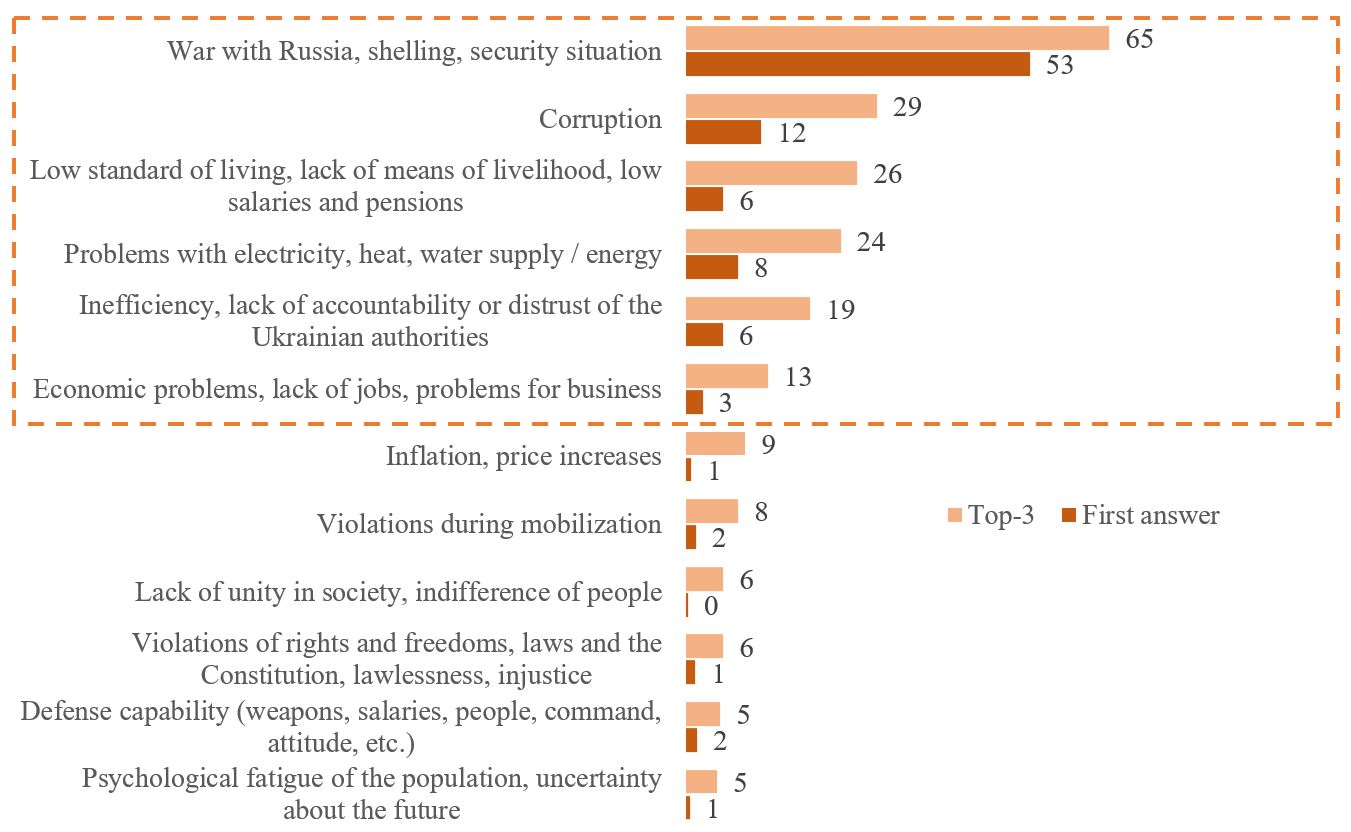 Graph 1. In your opinion, what are the most serious problems or challenges that Ukraine and Ukrainians are currently facing? Name up to 3 answers. open question, top answers