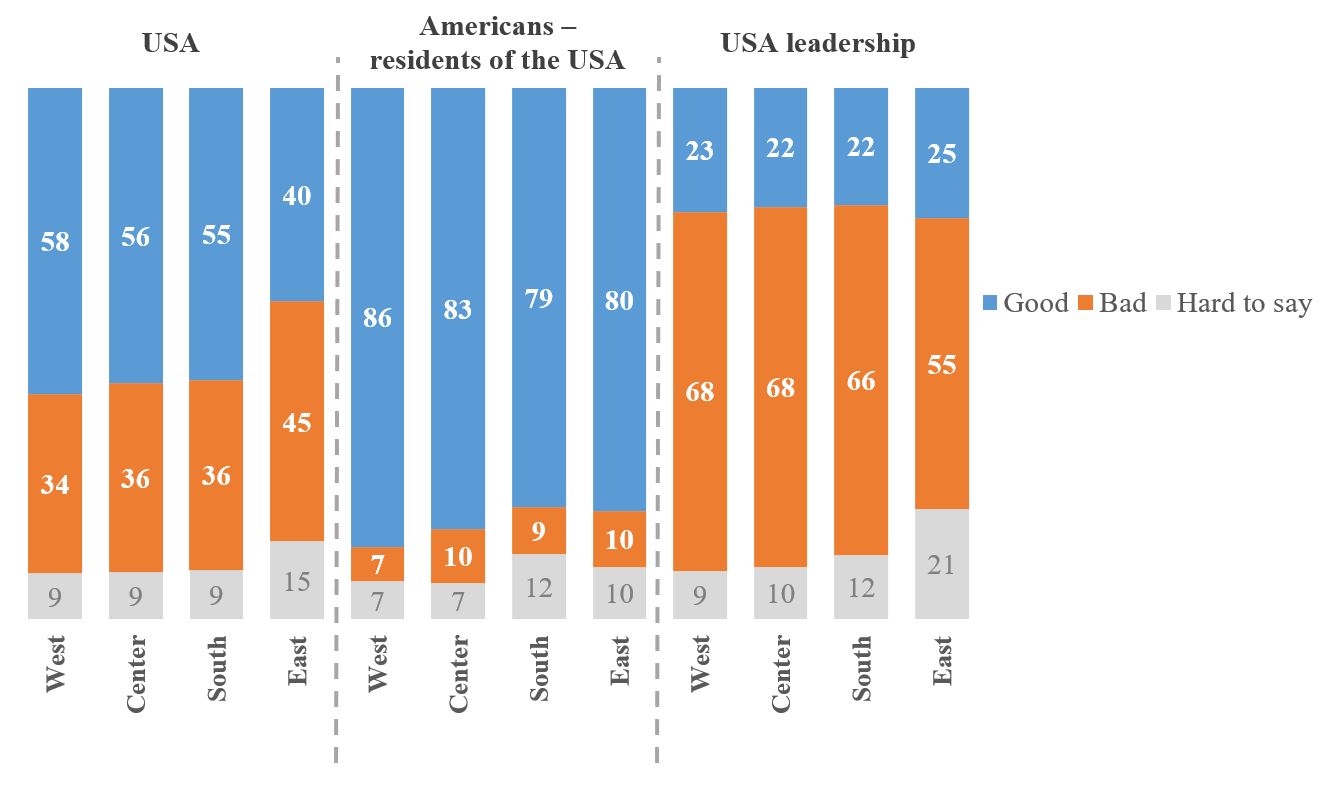 The graph below shows the data in a regional dimension[1]. In almost all cases, the figures do not differ significantly between regions. The only exception is the attitude towards the US in general in the East, where only 40% answered “good” (compared to 55-58% in other regions). However, in the case of attitudes towards Americans living in the US and the US leadership, respondents in the East do not differ significantly.
