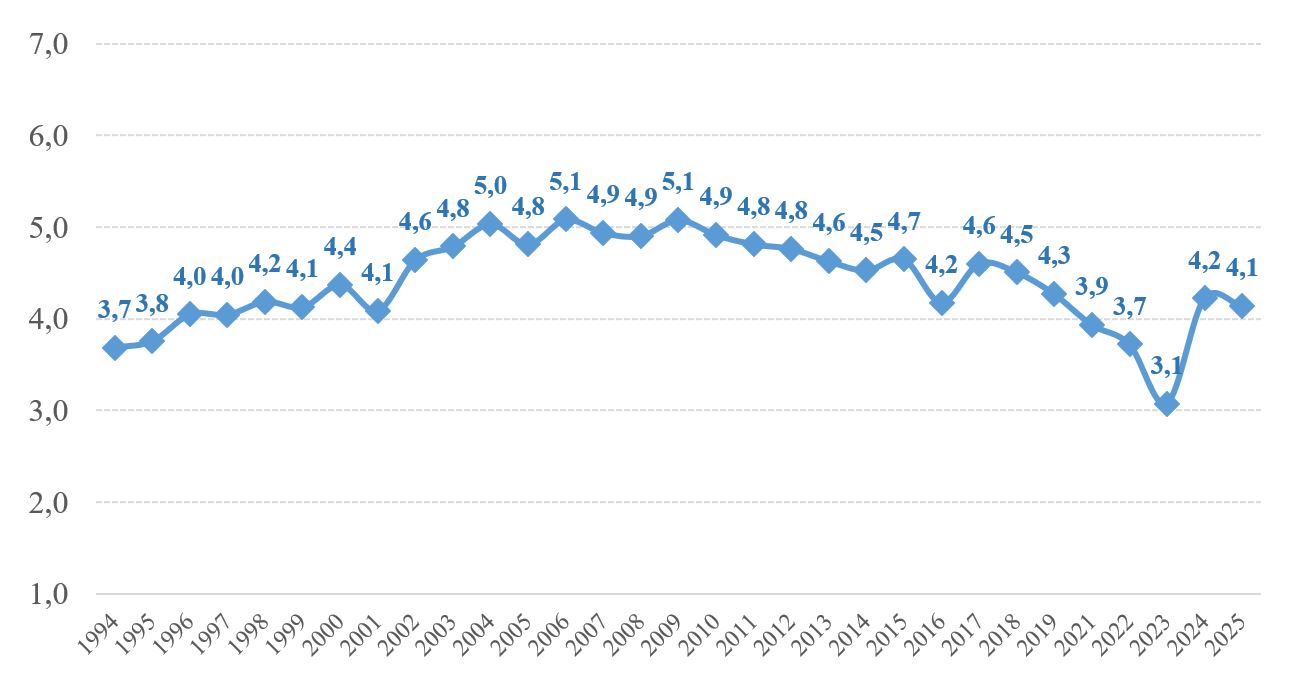 Also, KIIS has been conducting a study of the attitude of the Ukrainian population towards certain ethnic groups since 1994. This study is conducted using the scale of the American sociologist Emory Bogardus (adapted by N. Panina). For each ethnic group from the list, respondents must answer how close a relationship they are willing to allow with representatives of each group. This is called social distance. The minimum social distance is 1 (agree to allow as a family member), the maximum is 7 (would not allow to enter Ukraine). Often, the level of social distance is interpreted as the level of prejudice towards a particular group. Prominent Ukrainian sociologists N. Panina and E. Golovakha, analyzing the results for all groups, state that values less than 4.0 indicate openness (tolerance), and values from 4 to 5 indicate national isolation (they want to communicate with representatives of their ethnic group in their family and with friends, and are ready to communicate with other groups with their neighbors and at work). The same interpretation can be applied to the analysis of individual groups. The last time KIIS asked this question was in September 2025 and KIIS is currently preparing the publication (for all groups we studied). Graph 3 below shows the results for Americans. For context: Ukrainian-speaking Ukrainians have the best attitude – 2.4, the worst – Russians living in Russia with a figure of 6.5. As you can see, since the beginning of the 1990s, the attitude towards Americans has been deteriorating and was relatively worst in the 2000s. Thus, the average indicator for the period 1994-1999 was 4.0 points, then it reached a maximum value of 5.1 points in 2006 and 2009. At the same time, since 2010, you can see a trend towards, albeit not very significant, improvement in the attitude. Although the trend towards improving attitudes was observed even before the full-scale invasion, the large-scale support of the United States had a positive impact on the perception of Americans. If in 2021 the indicator was 3.9, then in 2022 it was 3.7, and in 2023 (in September) it reached a historic level of 3.1 points. However, already in 2024 (apparently, against the background of the blocking of aid in the US Congress and unfulfilled expectations from 2023) the indicator deteriorated to 4.2 points. As of September 2025, it is 4.1 points. That is, despite the fact that D. Trump’s actions often cause criticism from the Ukrainian public, this figure has not changed significantly during his presidency.