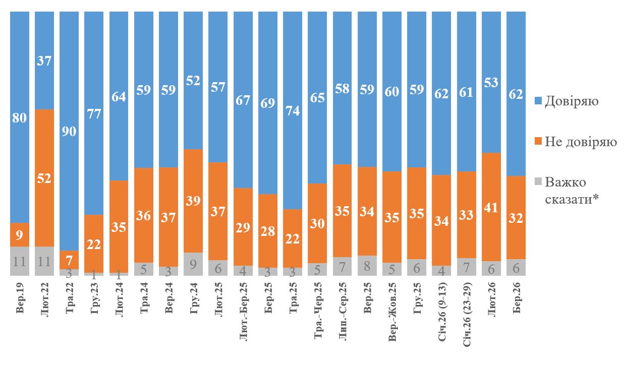 Упродовж 1-8 березня 2026 року Київський міжнародний інститут соціології (КМІС) провів власне всеукраїнське опитування громадської думки «Омнібус», куди за власною ініціативою додав запитання про довіру до В. Зеленського і про національні вибори. Методом телефонних інтерв’ю (computer-assistedtelephoneinterviews, CATI) на основі випадкової вибірки мобільних телефонних номерів (з випадковою генерацією телефонних номерів та подальшим статистичним зважуванням) у всіх регіонах України (підконтрольна Уряду України територія) було опитано 1003 респонденти. Опитування проводилося з дорослими (у віці 18 років і старше) громадянами України, які на момент опитування проживали на території України, яка контролювалася Урядом України. До вибірки не включалися жителі територій, які тимчасово не контролюються владою України (водночас частина респондентів – це ВПО, які переїхали з окупованих територій), а також опитування не проводилося з громадянами, які виїхали за кордон після 24 лютого 2022 року. Формально за звичайних обставин статистична похибка такої вибірки (з імовірністю 0,95 і з врахуванням дизайн-ефекту 1,3) не перевищувала 4,1% для показників, близьких до 50%, 3,5% для показників, близьких до 25%, 2,5% - для показників, близьких до 10%, 1,8% - для показників, близьких до 5%. За умов війни крім зазначеної формальної похибки додається певне систематичне відхилення. Фактори, що можуть впливати на якість результатів в умовах «воєнного часу», наводилися раніше КМІС. Загалом, ми вважаємо, що отримані результати все одно зберігають високу репрезентативність та дозволяють досить надійно аналізувати суспільні настрої населення.