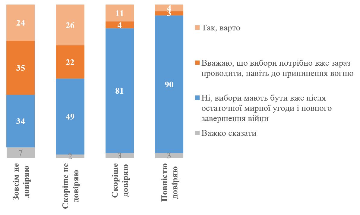 На графіку нижче підтримка проведення виборів подана у розрізі довіри Президенту. Так, серед тих, довіряє В. Зеленському переважна більшість виступає за проведення виборів лише після остаточної мирної угоди. Серед же тих, хто «скоріше» не довіряє Президенту, 49% вважають, що вибори мають бути після остаточної мирної угоди, а 26% готові схвалити вибори після перемир’я з гарантіями безпеки. Водночас і серед них меншість (22%) наполягають на виборах навіть до завершення бойових дій. Серед тих, хто «зовсім» не довіряє В. Зеленському, запит на вибори дещо вищий, але також меншість (35%) говорять про вибори до завершення бойових дій. Натомість 24% говорять про вибори після перемир’я з гарантіями безпеки, а 34% вважає, що вибори мають бути вже після остаточної мирної угоди.