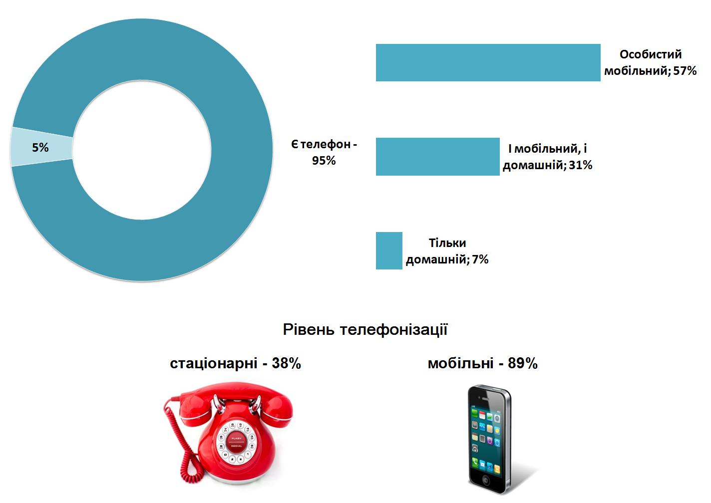 Прес-реліз підготовлений Наталею Харченко. Навесні 2015 року користувачів мобільного зв’язку серед дорослого населення було в 2.3 рази більше, ніж стаціонарного: 89% мешканців України є користувачами мобільного зв’язку, і лише 38% - стаціонарного. Відсоток користувачів стаціонарного зв’язку продовжує падати. З 20 травня по 2 червня 2015 року Київський міжнародний інститут соціології (КМІС) провів опитування громадської думки дорослого населення України. Методом особистого інтерв'ю опитано 2022 респондента віком від 18 років, що мешкають у всіх областях України, окрім автономної республіки Крим. У Луганській області опитування проводилися тільки на територіях, що контролюється Україною, у Донецькій області дослідження проводилося і на територіях, що контролюються і на територіях, що не контролюються Україною. Статистична похибка вибірки (з імовірністю 0.95 і за дизайн-ефекту 1.5) не перевищує: 3.3% для показників близьких до 50%, 2,8% - для показників близьких до 25%, 2,0% - для показників близьких до 10%, 1,4% - для показників близьких до 5%. Станом на травень 2015 року стаціонарним телефонним зв’язком користувалося 38% дорослого населення, у той час коли частка користувачів мобільного зв'язку досягла 89%, серед яких у 57% є тільки особистий мобільний телефон, а 31% є власниками одночасно і мобільного і домашнього телефонів. Тільки домашній телефон є у 7% населення і жодного телефону немає у кожного двадцятого опитаного (5%).