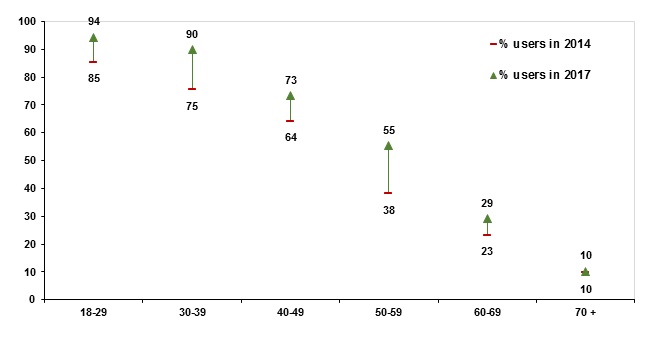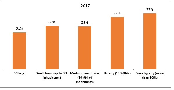 On May 19- 28. 2017 Kyiv International Institute of Sociology (KIIS) conducted an all-Ukrainian public opinion poll. Data were collected from 2040 respondents living in 108 settlements (PSU) in all oblasts of Ukraine (except for the AR of Crimea) with the method of personal interviewing. The sample was stochastic and is representative of the population of Ukraine aged 18 and above. In Luhansk and Donetsk oblasts survey was conducted only in the territories that are controlled by the Ukrainian government. The statistical sampling error (with a probability of 0.95 and for a design effect of 1.5) does not exceed: 3.3% — for indexes close to 50%, 2.8% — for indexes close to 25%, 2.0% — for indexes close to 10%, 1.4% — for indexes close to 5%. In May of 2017. 63.4% of the adult population of Ukraine were users of the Internet (graph 1). The growth in the number of Internet users has slowed down, and there are no significant differences compared with last year's data. Graph 1. Share of the Internet users among the adult population of Ukraine ![]() The main disparity factors in the distribution of the Internet in Ukraine remain unchanged – they are the age and type of settlement. As before, there is a reverse relation between the age and the use of the Internet - the younger the age, the higher the penetration of the Internet. It is correct to make a through time comparison since 2014. after we lost the opportunity to explore part of the population of Ukraine because of events in the AR of Crimea and in the Donbass. As we see (graph 2), over the past four years the number of Internet users has increased among all age groups younger than 60. The more active phase of this growth is for 2015-2016. Graph 2. Share of the Internet users among different age groups ![]() The imbalances in the penetration of the Internet in the settlements of the different size significantly smoothed over in the recent years (graph 3). At the moment, rural areas are far behind in the distribution of the Internet, its inhabitants more often refer to the restrictions on the technical connectivity of sparsely populated places. Graph 3. Share of the Internet users among the population of different types of settlements ![]() The most commonly used devices for the usage of the Internet are mobile phones (39%), home laptops (31%) and stationary computers (30%), see. graph 4 (the total percentage is over 100. since one person can use several devices). Today, 41.6% of the adult population in Ukraine use the Internet on mobile devices (mobile phones or tablets) at least once a month, while online access via home-based stationary computer or laptop is 54.4%, and still retains its advantage in use. Graph 4. Places and devices to access the Internet ![]() Commentary of V. Paniotto, CEO of KIIS Comparison of data from various surveys on the percentage of Internet users among the population of Ukraine depends primarily on (1) the age limits for which the percentage is calculated, and (2) who is considered to be Internet users - those who use the Internet almost every day, several times a week , ³everal times for two weeks, etc. In this study, all percentages are calculated for the population of Ukraine aged 18 and older, and users are considered to be those who use the Internet at least sometimes. Although the growth rate of the total number of Internet users has slowed down somewhat, the number of Internet users who access the Internet with the use of smartphones is substantially increasing. Addition. Questions and tables