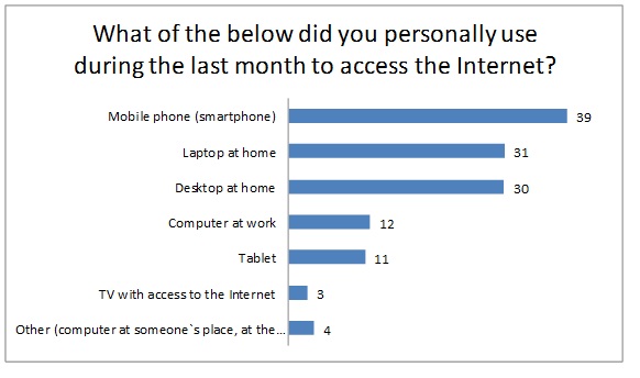 In the spring of 2017 63% of the adult population of Ukraine were users of the Internet. The most popular is access to the Internet through a home-based stationary computer or laptop (54%), although today, 42% of the adult population in Ukraine, at least once a month, use the Internet on mobile devices (primarily on smartphones).