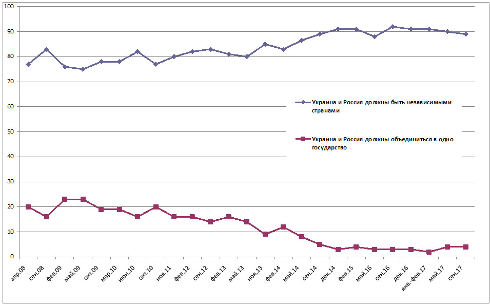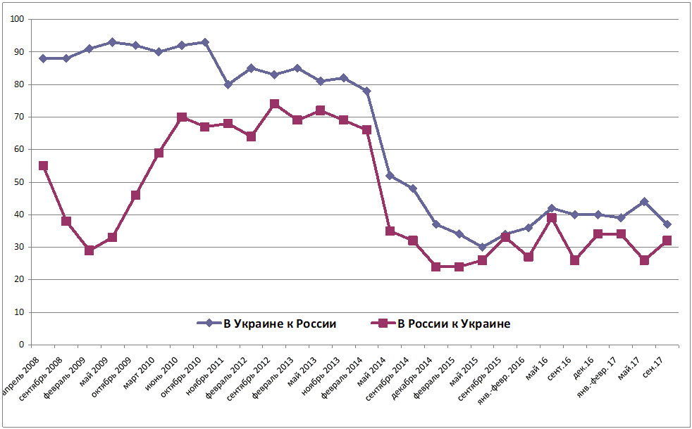 Количество положительно настроенных к России украинцев с мая 2017 г. несколько уменьшилась и в сентябре 2017г. составляет 37% (в мае было 44%). В России количество положительно настроенных к Украине россиян немного выросла и в сентябре 2017г. составляет — 32% (а в мае был 26%). Отношение населения Украины к России с 2008 года остается лучшим, чем отношение населения России к Украине.