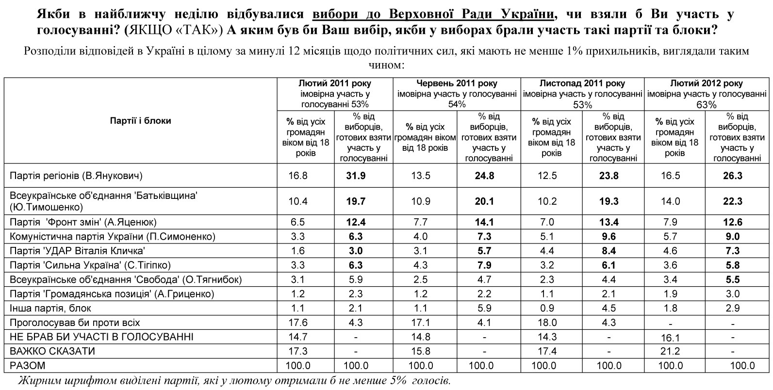 Протягом 10–19 лютого 2012 року КМІС провів всеукраїнське опитування громадської думки. Методом інтерв'ю опитано 4006 респонденти, що мешкають в усіх областях України (включно з містом Києвом) та в Криму за стохастичною вибіркою, репрезентативною для населення України віком від 18 років.