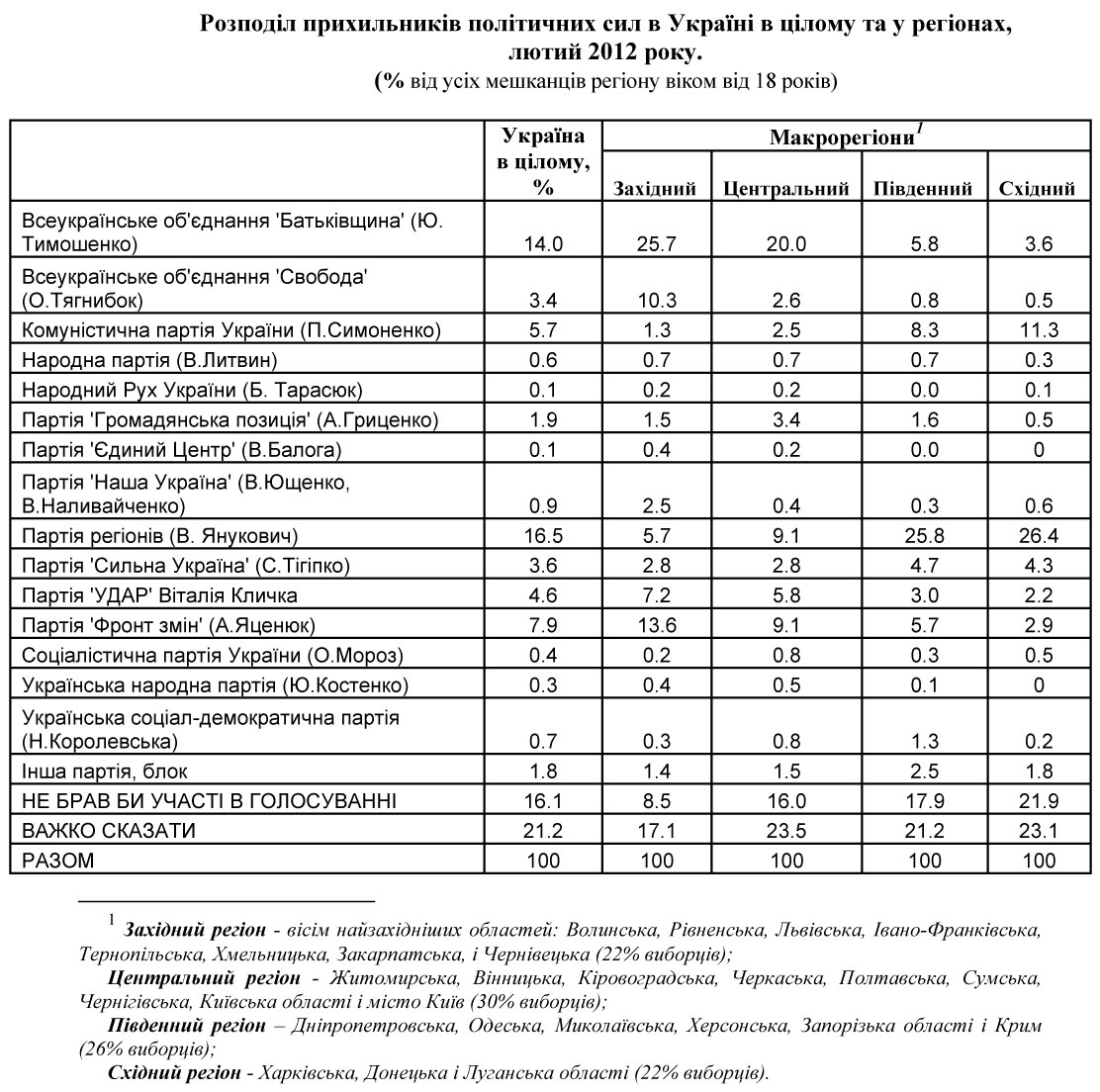 - За Всеукраїнське об'єднання 'Батькiвщина' (Ю. Тимошенко) готові віддати свої голоси 26% мешканців Західного регіону, 20% — Центрального, 6% — Південного та 4% — Східного регіонів;