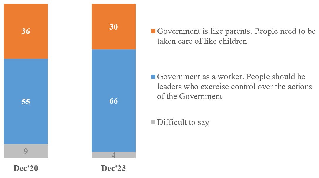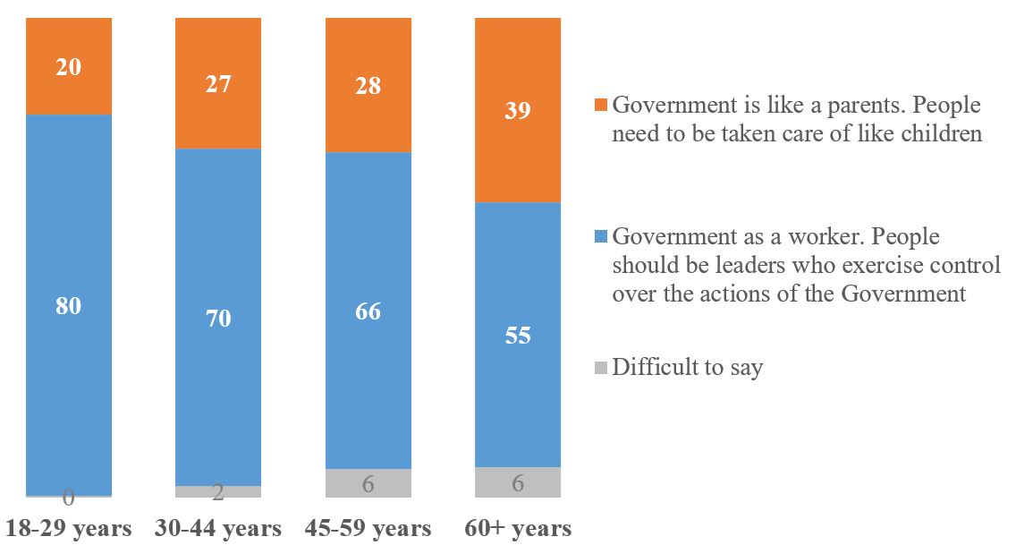 Among younger respondents, the view of the Government as a worker is more pronounced – 80% among people under the age of 30, 66-70% among people aged 30-59 and "only" 55% among people aged 60 and older. Along with this, the share of those who see father in the Government increases with age - from 20% among people under the age of 30 to 39% among people aged 60 and older.