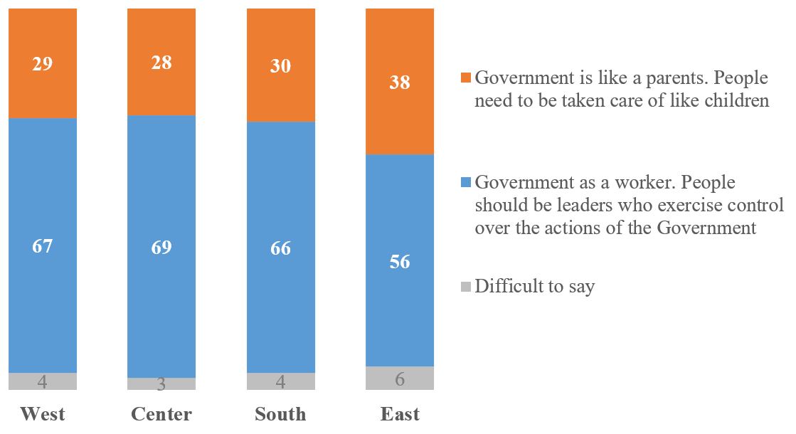 In all regions, the majority of the population tends to view the Government as a worker. Only the East stands out somewhat, where there are slightly more people who perceive the Government as a father (38% versus 28-30% in other regions).
