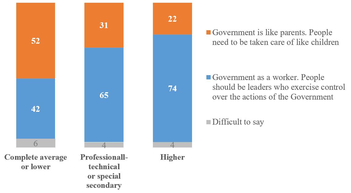 Significant dependence can be traced with the education of the respondents. If among persons with higher education, 74% see the Government as a worker, then among persons with vocational or technical secondary education – 65%, and among persons with complete secondary education or below – 42%. Along with this, the share of those who see the Government as a father increases from 22% among persons with a higher education to 52% among persons with a complete secondary education or less.
