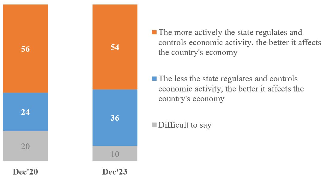 The issue of relations between the public and the Government / state can be looked at from the point of view of the economic sphere. Does the latter need deregulation and greater freedom of action, or, on the contrary, should the Government / state be a powerful player that actively regulates and controls economic activity in the country. A little more than half of Ukrainians - 54% - believe that the more actively the state regulates and controls economic activity, the better it affects the country's economy (three years ago there were 56 %). The share of those who want less regulation and control is 36% (an increase from 24% in 2020).
